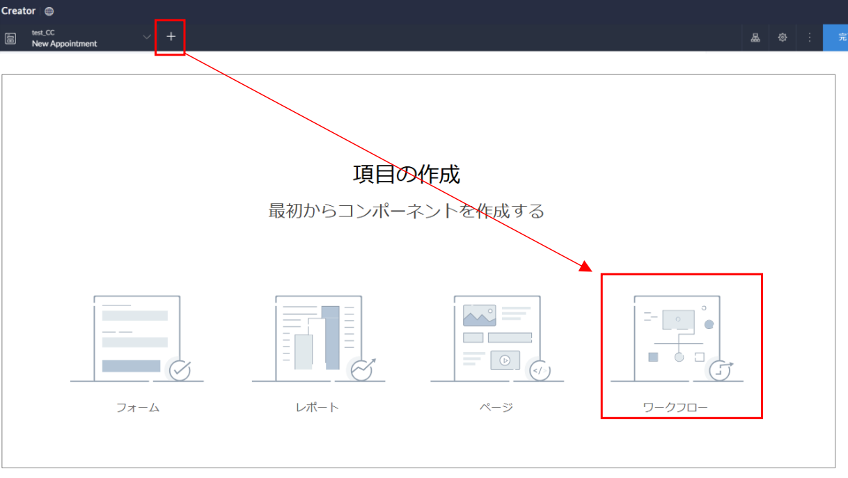 ワークフローを作成するためには、まず該当のアプリケーションの設定画面で、「+」を押していただくとワークフローを追加することが出来ます。