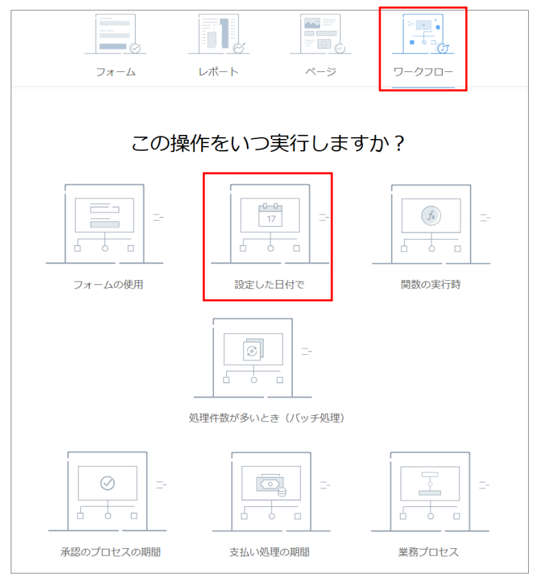 これらの処理は、フォーム内の日付や時間の値、あるいは特定の日時に基づいて定期的に実行可能です。