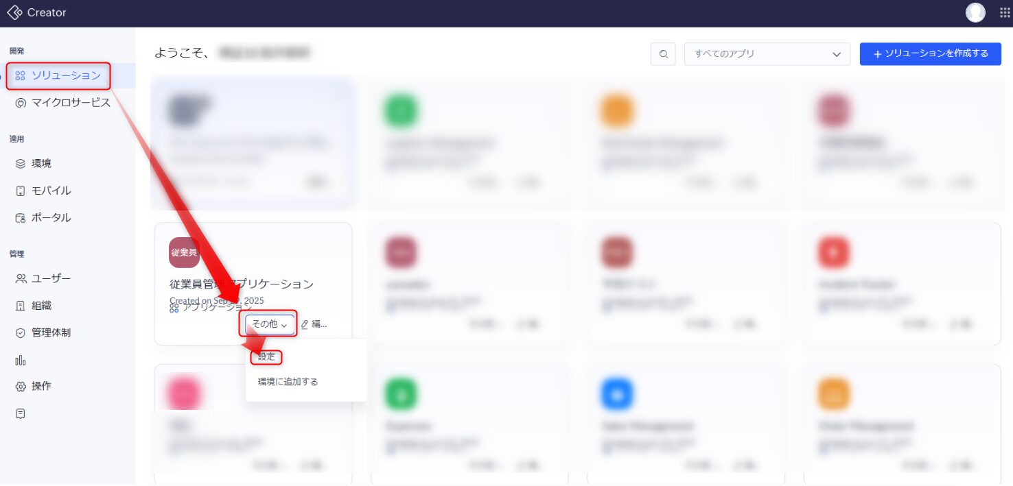 ソリューション画面 > 設定したいアプリケーションの「その他」>「設定」>「ユーザーの権限」