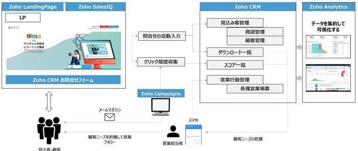 Zoho CRMやZoho Campaignsなどと連携することができるので、ランディングページから頂いたお問い合わせをZoho CRMで集約し、見込み客・商談・営業の行動管理に繋げることができます。